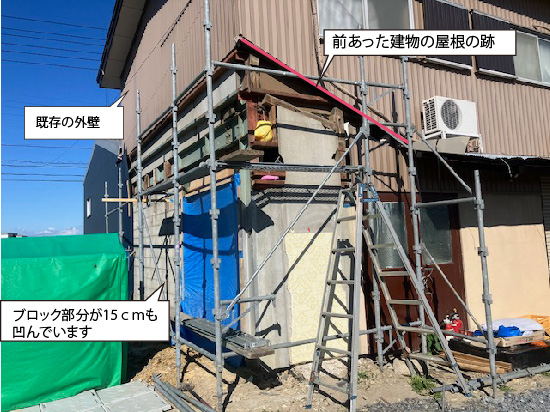 まず 外壁面が凸凹ですね、上部の既存外壁より、下部のブロック面が15cmほど凹んでいます。