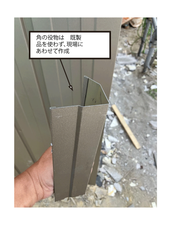 外壁コーナー部分も建物が傾いているため、上部と下部の幅が違います。
