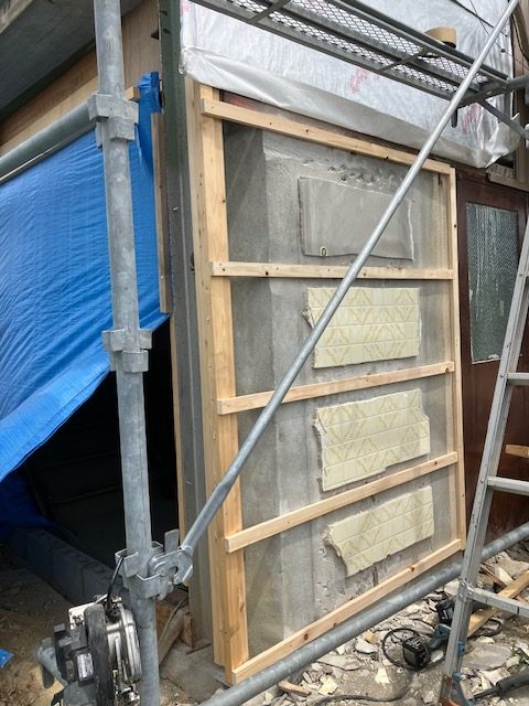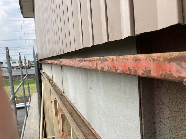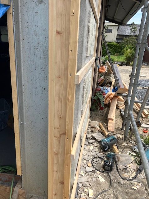 既存の外壁と繫ぐ部分は 手前と奥で5㎝違うため レベルを確認し 水平にカットしました。